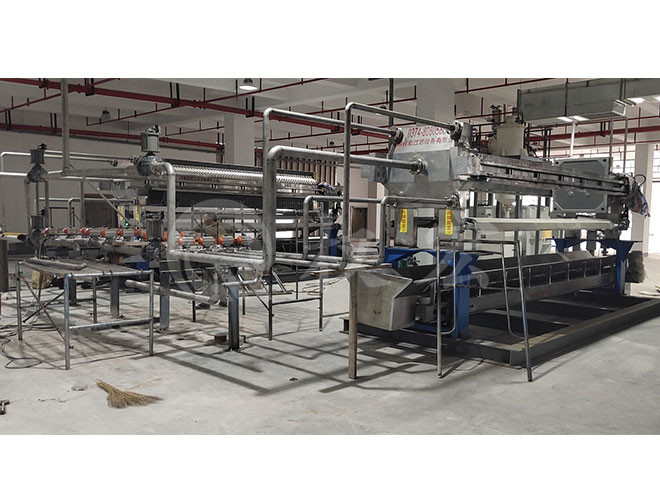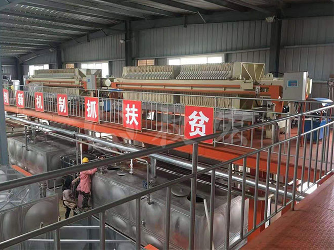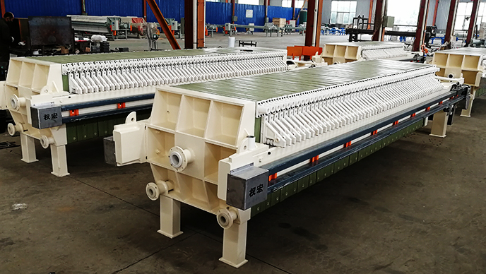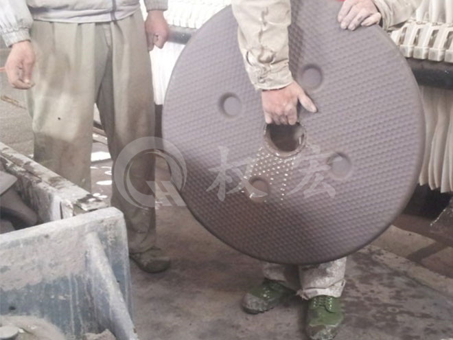 隔膜壓濾機由隔膜板和廂式濾板共同組成濾室,在輸料泵的壓力作用下將漿料輸入濾室,通過過濾介質(濾布)將漿料中的固體和液體分離,當漿料中的固體形成濾餅后,再向隔膜充入空氣或液體,隔膜板鼓脹實現對濾室內的固體的二次壓榨,以降低濾餅的含水率。隔膜壓濾機適合對于粘性物料的過濾及對含水率要求較高的用戶。 隔膜濾板采用增強聚丙烯模壓而成,隔膜與聚丙烯板鑲嵌在一起,堅固牢靠、不易脫落、使用壽命更長。 -
